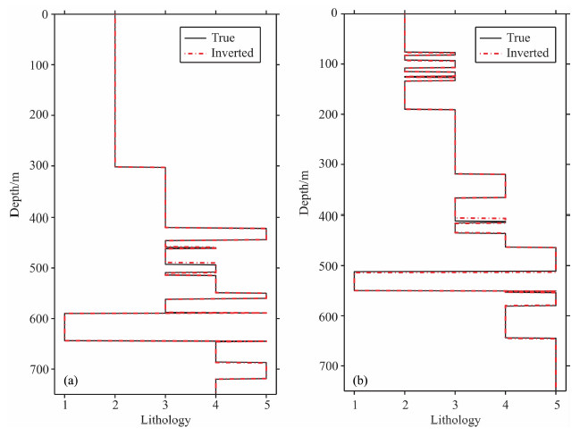 图 10为加入1%和5%的误差后岩性识别的结果.从图中可以看出,随着误差的增大,各种岩性大致上还是比较清楚地区分开,同时,岩层的空间结构也得到较好地刻画.这表明该方法在反演结果不太准确的条件下,也有比较准确的识别结果.但同时,对比图 10a和图 10b可以发现,随着误差的增大,岩性识别的结果会受到一定影响,一些岩性层变得不连续,产生模糊的边界.这表明反演的不确定性会对岩性识别产生一定程度的影响,并且随着误差比例的增加,对岩性识别结果的影响也会增强.