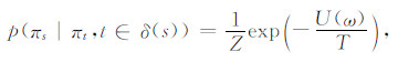 Hammersley-Clifford定理:设S是一个邻域系统,当且仅当p(π)是一个关于S的Gibbs分布时,π是关于S的马尔科夫随机场.Gibbs的分布形式为[21]