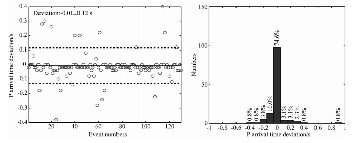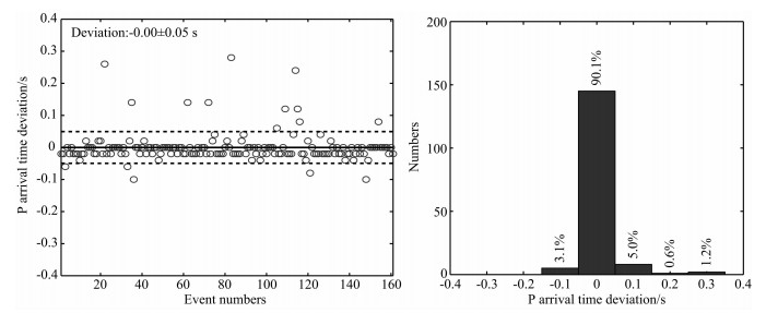 图 9 网内地震P波自动拾取偏差 Fig. 9 P-arrival picking results of the earthquakes inside the network |