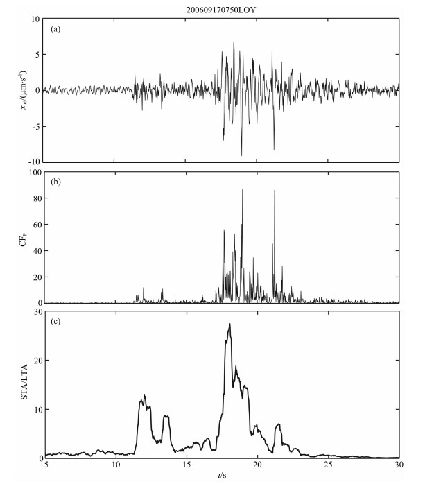 在P波到来后,记录的幅值会有较大的变化,在短窗内,其平均值STA变化快,刻画的主要是信号幅值的瞬时变化,其窗长一般取长于待测特征信号的几个周期左右,太短则对短周期的干扰更敏感,容易产生误触发,如果太长则显示不出待测信号的瞬时特征,容易产生漏触发;在长窗内其平均值LTA变化稍缓,刻画的是相对于待检信号的背景噪声平均大小,其窗长取值应该能反映背景噪声水平. STA/LTA进一步刻画了记录幅值的瞬时变化,在求STA/LTA后,其特征变得更为明显,由于记录的平均,其时程曲线变的更为平滑.设定一定的触发阈值,如果STA/LTA值超过设定阈值,则认为P波触发,对于阈值的选取,如果阈值过大,则有可能会出现漏触发,如果太小,则对很多微弱干扰会产生误触发.经过对大量记录的试验,对P波拾取中所用短时间及长时间窗长及阈值参数如表 1所示.图 2为对一典型记录(2006年9月17日在福建省华安ML2.5级地震龙岩台记录)求取特征函数并计算STA/LTA的结果,由图中可以看出,在求取特征函数后,其P波特征被放大,在求取STA/LTA后其P波段上升明显.STA/LTA方法的突出优点为适应性强、拾取效率高、稳定可靠,其缺点一是其触发点一般滞后于实际P波到时点,二是如果记录中存在干扰信号,对于设定阈值同样会产生地震事件触发.
