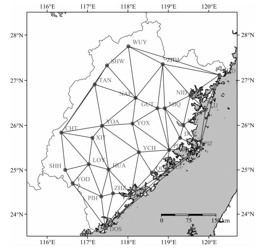 图 4 福建数字地震台网台站Delaunay三角剖分图 Fig. 4 Delaunay triangulation of Fujian digital seismic net work |