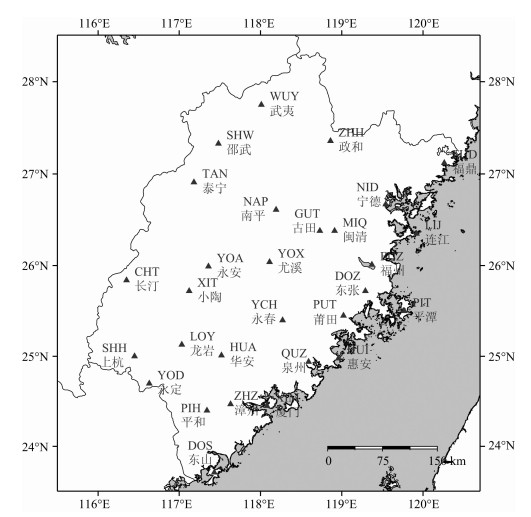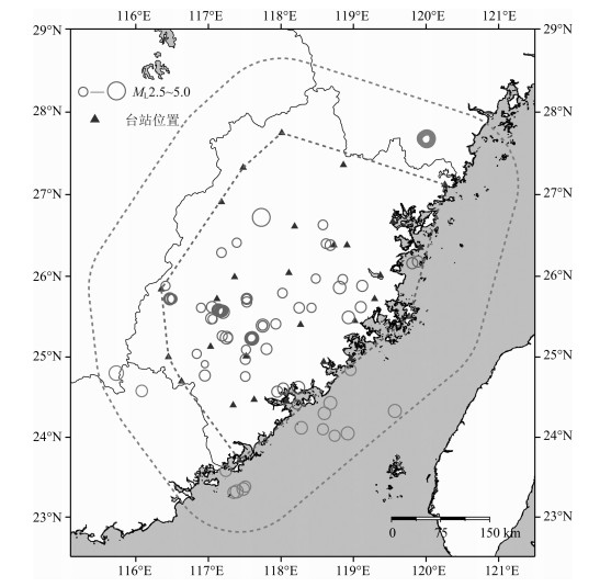 5 计算实例 5.1 所用数据我们应用了福建数字地震台网自2000年2月至2007年3月,记录到的所有ML≥2. 5网内地震82个,最大震级ML=4.9, 2005年7月至2007年5月所有网外100 km范围内(网缘至网缘以外100 km) ML≥3.0地震67个,最大震级ML=4.8.地震台站及震中分布如图 7和图 8所示.