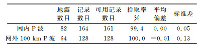 表 2 网内地震及网外100 km地震拾取结果 Table 2 P-arrival picking results of inside and 100 km outside seismic network |