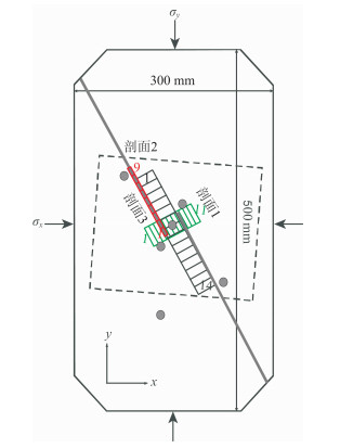 图 1 标本结构及研究区 灰色粗实线为预制断层,虚线框为热像观测区域,灰色实心圆为接触式测温仪探头所在位置,绿色、黑色及红色条形框区域分别为剖面1、2、3. Fig. 1 Specimen structure and study area Gray thick solid line is precut fault, the dashed line is observation range, gray solid circle s location of contact-type thermometer, green, black and red areas are profile 1, 2, 3. |