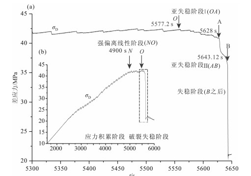 3 实验结果 3.1 破裂失稳阶段的划分以N点为分界点,变形包含应力积累和破裂失稳两个阶段,应力积累阶段伴随小黏滑事件(图 2b).本次研究着重分析破裂失稳阶段(图 2a).图 2b显示在N点(第4900 s)出现了强烈的偏离线性现象,图 2a显示N点后差应力仍以较低速率增加,到第5577.2 s达到峰值点O.O之后差应力以较慢速率下降,处于应力相持阶段.到5628 s达到转折点A.A点后差应力加速释放,2~3 s后释放速率变小.十多秒后到达失稳点B,即第5643.12 s,释放速率迅速增大,发生失稳错动.这一过程可由N、O、A、B划分为四个阶段:NO称之为“强偏离线性阶段”,OA称之为“亚失稳阶段Ⅰ”,AB称之为“亚失稳阶段Ⅱ”,B之后是“失稳阶段”.