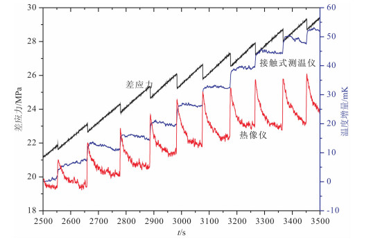 图 3 温度与差应力随时间的变化 红色和蓝色曲线分别表示红外热像仪和接触式测温仪的测温结果. Fig. 3 Variation of temperature and differential stress with time Red and blue curvesrepresent temperature results of infrared thermal image and contact-type thermometer respectively. |