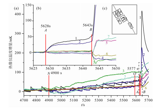 图 4 不同构造部位的平均温度随时间的变化 图 4b是图 4a中虚线框的放大图, 图 4a (图 4b)纵轴是温度相对于4500s (5620s)的增量; (c)构造部位分布图. Fig. 4 Variation of average temperature in different tectonic positions with time Fig.4a is the enlarged figure of the dotted area in Fig.4b; the vertical axis value is an incremental temperature versus 4500s (5620s) in Fig.4a(Fig.4b); Fig.4c is the sketch map of tectonic positions. |