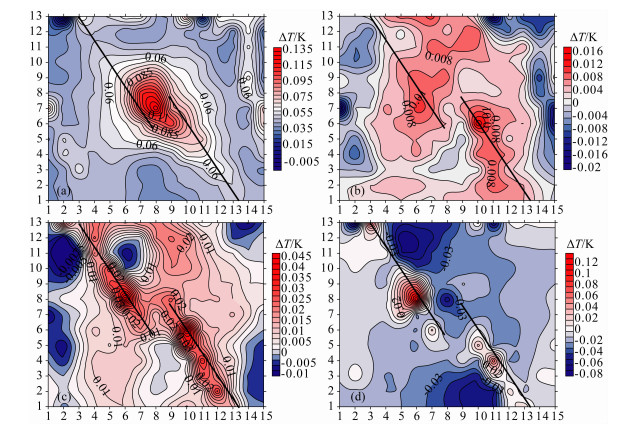 热像增量图更直观地表现出温度的时空变化.强偏离线性阶段(图 5a),岩桥区中心增温显著,约为134 mK,平均升温速率约为0. 23 mK/s; 亚失稳阶段I后期(图 5b)增温区逐渐转移到断层带,最高增温幅度达18mK,平均升温速率为0. 38mK/s; 亚失稳阶段n后期(图 5c),断层带增温更明显,且高温点增多,断层带内侧出现降温;破裂失稳瞬间(图 4d),只有断层区域升温,高达130 mK,平均升温速率65mK/s, 样本整体降温20~40mK, 平均降温速率为10~20 mK/s,降温以岩桥区和断层带内侧最为明显.失稳瞬间降温在以往的实验中观测得并不十分明显.
