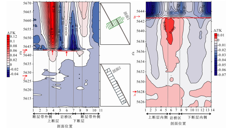 3.3 各剖面温度随时间的变化图 6a为剖面1温度随时间的变化(横坐标是剖面位置,纵坐标是时间.剖面1垂直于断层,位置见图 6b上图.位置4, 8为断层,5、6、7是岩桥区).A点前,温度随机变化.A点后,断层开始增温.临近B点时,岩桥区先降温,随即断层带迅速增温,发生错动.降温意味着岩桥区贯通,而岩桥区的贯通为断层错动提供了条件.断层带增温和岩桥区降温是亚失稳阶段的重要特点.