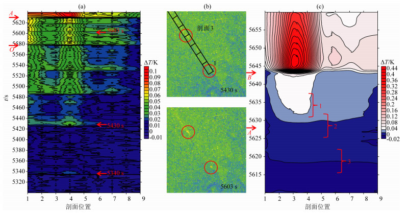 图 7 不同阶段沿上断层(剖面3)温度随时间的变化及热像图 (a)强偏离线性阶段-亚失稳阶段; (b)热像图及剖面位置示意; (c)亚失稳阶段-失稳阶段.图 7b红色箭头示意温度变化特殊位置, 图 7c红色括号及数字表示亚失稳阶段断层上三次阶梯式升温. Fig. 7 Temperature variations of profile along the fault (profile 3) in different stages and the thermal images with time (a) Strongly-deviation-from-linearity stage to meta-instability stage; (b) Thermal images and the sketch map of position of profile 3;(c) Meta-instability stage to instability stage. Red arrow show locations of special temperature changes in Fig.7a; red braces and numbers show three stepped temperature increase in the fault zones during stage of meta-instability in Fig.7c. |