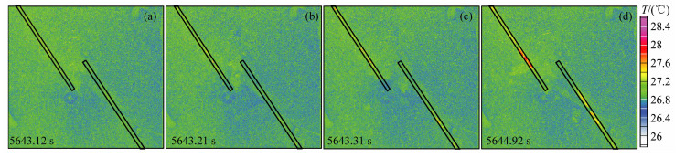 红外热像仪的基本参数:光谱范围8~12 μm,AD转换14bit,测温范围设定为0~40 ℃时,AD转换的最小温度分辨率2. 5 mK,噪声等效温差25 mK,空间分辨率640 × 512像素,本次实验每个像素对应于实际尺寸的0. 35 mm,实验中热像采集频率为10帧/s.