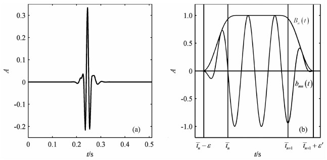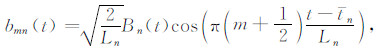 式中,bmn(t)表示具有波数指标m和位置指标n的局部余弦基,如图 1b所示,tn为区间起始位置,tn+1为区间终止位置,Ln=tn+1-tn为区间长度,Bn(t)为定义在闭区间[tn-ε,tn+1+ε']的钟形窗光滑函数,且tn+ε≤tn+1 -ε',ε和ε'分别为区间左、右两侧的重叠半径.在实际计算中,局部离散余弦变换一般不直接通过离散信号与局部离散余弦基的内积求得,而是先对数据进行分段折叠预处理[28],然后利用具有快速算法的离散Ⅳ型余弦变换求得.对于离散信号