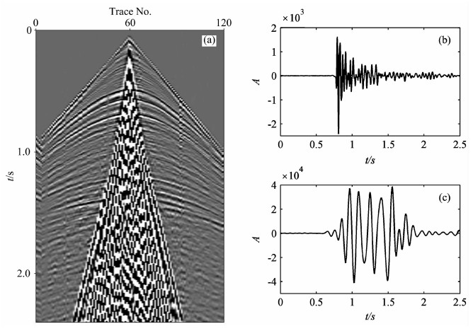 图 2 实际单炮地震记录及两种试验信号 (a)实际炮集记录;(b)从远偏移距地震道获取的试验体波信号;(c)从近偏移距地震道获取的试验面波信号. Fig. 2 Real seismic record and two test signals (a) Real shot gather; (b) Test body-wave signal acquired from far offset traces; (c) Test ground-roll signal acquired from near offset traces. |