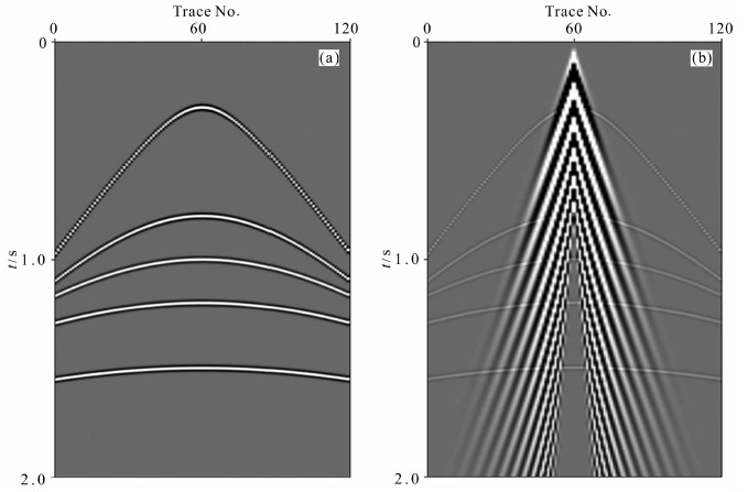 图 5 理论合成地震记录 (a)不含面波的合成地震记录;(b)包含面波干扰的合成地震记录. Fig. 5 Theoretically synthetic seismic records (a) Synthetic seismic data free ground-roll; (b) Synthetic seismic data containing ground-roll. |