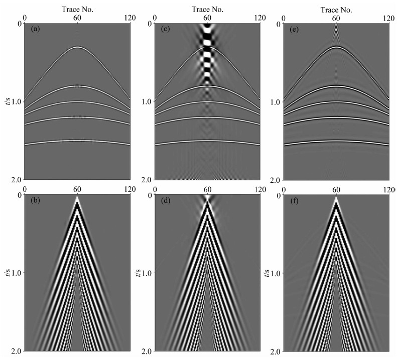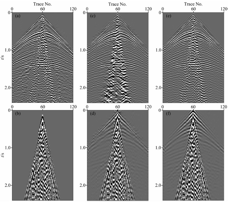 图 6 合成地震记录面波衰减效果对比 (a)基于形态成分分析方法得到的体波;(b)基于形态成分分析方法得到的面波干扰;(c)F-K滤波方法得到的体波;(d)F-K滤波方法得到的面波干扰;(e)高通滤波方法得到的体波;(f)高通滤波方法得到的面波干扰. Fig. 6 Comparison of ground-roll attenuation results of synthetic shot gather (a) Body wave obtained by MCA method; (b) Ground-roll noise obtained by MCA method; (c) Body wave obtained by F-K filtering method; (d) Ground-roll noise obtained by F-K filtering mentod; (e) Body wave obtained by high pass filtering method; (f) Ground-roll noise obtained by high pass filtering method. |