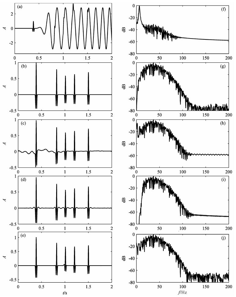 图 7 合成地震记录单道信号分析 (a)图 5b中第45道信号;(b)图 5a中第45道信号;(c)图 6c中第45道信号;(d)图 6e中第45道信号;(e)图 6a中第45道信号;(f)图 7a的振幅谱;(g)图 7b的振幅谱;(h)图 7c的振幅谱;(i)图 7d的振幅谱;(j)图 7e的振幅谱. Fig. 7 Analysis of single seismic trace in synthetic shot gather (a) The 45th trace signal in Fig.5b; (b) The 45th trace signal in Fig.5a; (c) The 45th trace signal in Fig.6c; (d) The 45th trace signal in Fig.6e; (e) The 45th trace signal in Fig.6a; (f) Amplitude spectrum of (a); (g) Amplitude spectrum of (b); (h) Amplitude spectrum of (c); (i) Amplitude spectrum of (d); (j) Amplitude spectrum of (e). |