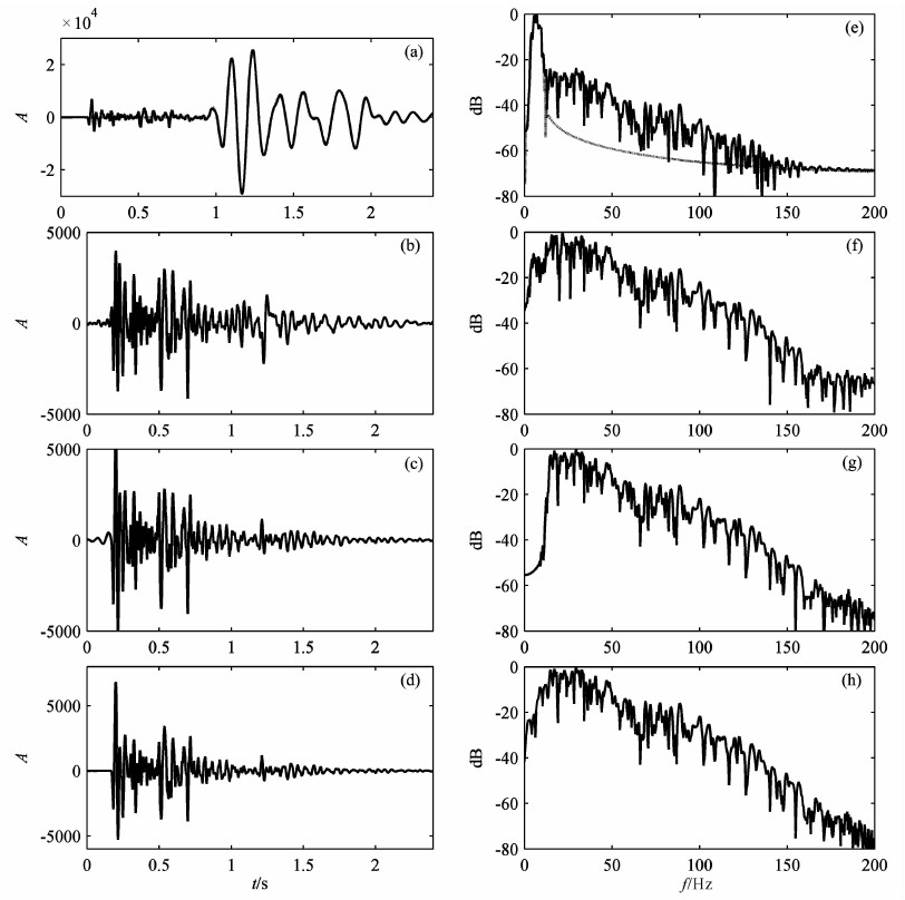 图 9 实际地震记录单道信号分析 (a)图 2a中第50道信号与图 8b中第50道信号(点划线); (b)图 8c中第50道信号; (c)图 8e中第50道信号; (d)图 8a中第50道信号; (e)图 9a的振幅谱; (f)图 9b的振幅谱; (g)图 9c的振幅谱; (h)图 9d的振幅谱. Fig. 9 Analysis of single trace in real seismic record (a) The 50th trace signal in Fig.2a; (b) The 50th trace signal in Fig.8c; (c) The 50th trace signal in Fig.8e; (d) The 50th trace signal in Fig.8a; (e) Amplitude spectrum of (a); (f) Amplitude spectrum of (b); (g) Amplitude spectrum of (c); (h) Amplitude spectrum of (d). |