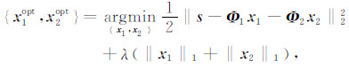 式中,Φ1x1对应于s中的第一类信号分量s1,Φ2x2对应于中s的第二类信号分量s2.通过求解优化问题(4),不仅获得信号s的稀疏表示,同时也实现了两种类型信号分量的有效分离.