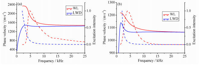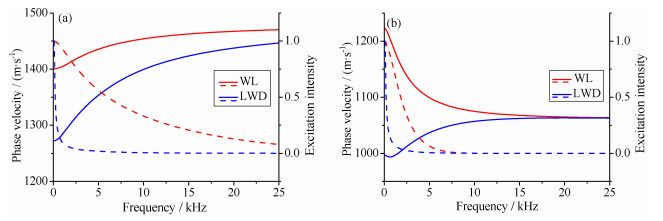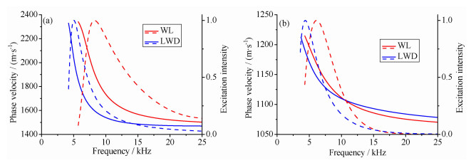 图 2 单极子斯通利波相速度频散与激发强度 (a)快速TI地层;(b)慢速TI地层.WL为电缆测井,LWD为随钻测井. Fig. 2 Phase-velocity dispersion curves and excitation intensity curves of ST waves (a) Fast TI formation; (b) Slow TI formation. |