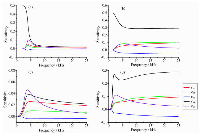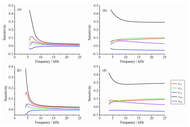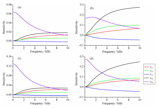 图 5 弯曲波对TI地层弹性常数的灵敏度 (a)电缆测井快速TI地层;(b)电缆测井慢速TI地层;(c)随钻测井快速TI地层;(d)随钻测井慢速TI地层. Fig. 5 Sensitivity curves of flexural waves (a) Fast TI formation of WL; (b) Slow TI formation of WL; (c) Fast TI formation of LWD; (d) Slow TI formation of LWD |