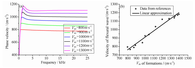 图 6 慢速地层中弯曲波相速度与地层垂直向横波速度的关系 Fig. 6 Relations between the phase-velocities of flexural waves and the velocities of vertically propagating shear wave in slow TI formation |
