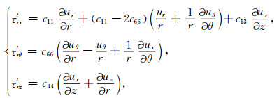 横向各向同性介质中位移分量与势函数的关系式与式(8)相同,而应力应变关系如下式所示: