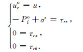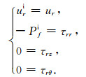 上述模型的三个边界,即钻铤内流体与钻铤内壁边界处,钻铤外壁与钻铤外流体边界处,钻铤外流体与地层边界处,a,b和c分别代表钻铤内半径,钻铤外半径和井孔半径.在这些固-液边界处根据法向位移和应力的连续性可得所有边界条件如下: