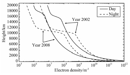2 模型和方法 2.1 Global Core Plasma ModelGPS卫星的轨道高度大致为20200 km,载波信号传播的范围涵盖了电离层和等离子体层,因而在分析电离层薄壳高度的问题时需要使用涵盖电离层和等离子体层的模型.现在已有多种成熟的半经验和经验的等离子体模型可供使用.在众多模型中GCPM被选中进行这一研究.GCPM由Gallagher等(2000)开发.它建立在多颗卫星的观测基础之上,由关于电离层、等离子体层、等离子体层顶、槽区和极盖区的多个经验模型综合而成.这一模型主要以Kp指数为输入参量,能够提供电离层和等离子体层范围内的特定时间和地点的电子、氢离子、氦离子和氧离子密度.经过多年发展,该模型能够反映地磁活动、地方时、季节、太阳活动和太阳活动周变化等带来的影响.目前最新的版本为2.4版,该模型在电离层高度上使用国际参考电离层模型(International Reference Ionosphere,IRI)2007版的输出结果.相比于其他等离子体模型,该模型具有以下优势:(1)作为一个经验模型,GCPM能够提供比理论模型更贴近实际的计算结果,同时其计算速度也更快;(2)GCPM的输出量及其导数是连续的;(3)该模型的源代码完全开放,易于获取,可以根据研究需要进行修改.在本工作中,通过修改GCPM的源代码,我们将较新的IRI 2012模型移植进入GCPM之中,以代替较老的IRI 2007模型.当选取的时间在2007年之后时,老版本的模型只能根据预测的太阳活动情况进行计算,而新版本的模型更新了空间环境参量数据库,能够提供更可靠的计算结果.图 1给出了太阳活动高年(2002年)和低年(2008年)由GCPM模型得到的电子密度剖面.