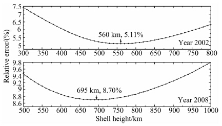 给定接收机的位置、卫星方位角和仰角,就可以计算出一个转换带来的相对误差.所有相对误差的平均值可以作为衡量薄壳高度优劣的指标.图 10给出了不同的薄壳高度带来的相对误差.在2002年这一太阳活动高年,最佳的薄壳高度为560 km,此时平均的相对误差为5.11%.而在2008年这一太阳活动低年,最佳高度为695 km,平均相对误差为8.70%.