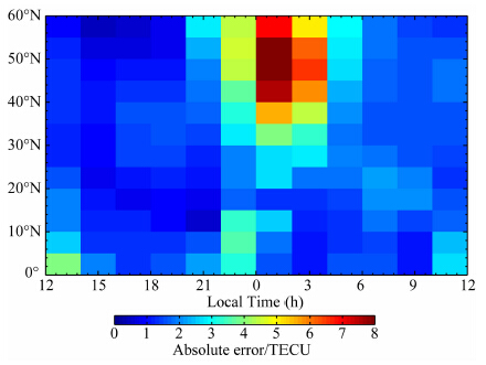 ![]() | 图 12 薄壳高度为695 km时转换的电离层TEC与电离层TEC“真实值”的绝对误差随接收机纬度和地方时的分布(2008年)Fig. 12 Distribution of absolute error of converted ionospheric TEC with latitude and local time in 2008. The shell height is 695 km |