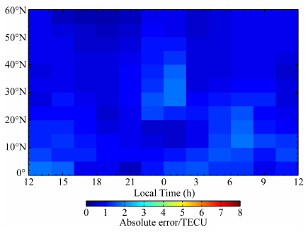Fig. 11 Distribution of absolute error of converted ionospheric TEC with latitude and local time in 2002. The shell height is 560 km |