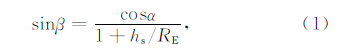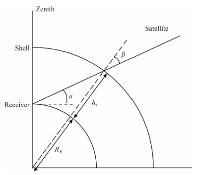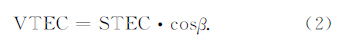 2.2 检验薄壳高度的计算方法图 2为利用薄壳模型计算垂直TEC的几何图,RE为地球半径,hs为薄壳高度,α为卫星仰角,β为IPP处卫星的天顶角.当卫星相对地面接收机的仰角为α时,角度β满足: