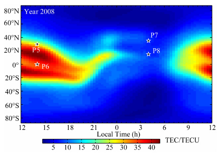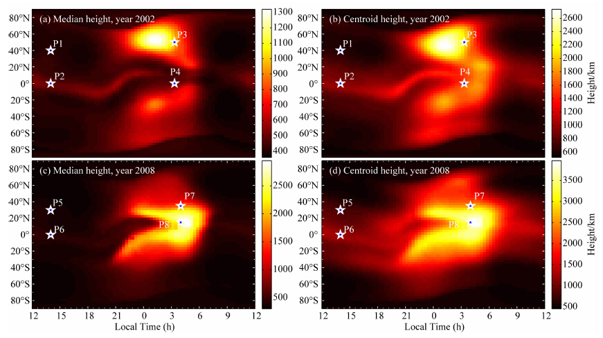 综合考虑TEC和质心高度的全球分布情况,在2002年和2008年的春分日,各选取4个代表点,即图 3—5中的P1—P8.这8个点的地理纬度和经度见表 1.其中P1、P2、P5和P6位于日侧,代表了TEC水平梯度较大的地区;而P3、P4、P7和P8位于夜侧,代表了质心高度的水平梯度较大的地区.在3.2—3.4节中,将对这8个代表点的薄壳有效高度进行分析.