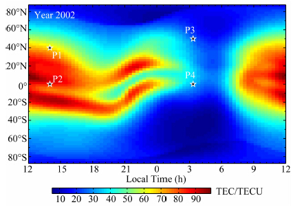![]() | 图 4 GCPM模型计算得到的TEC全球分布图.