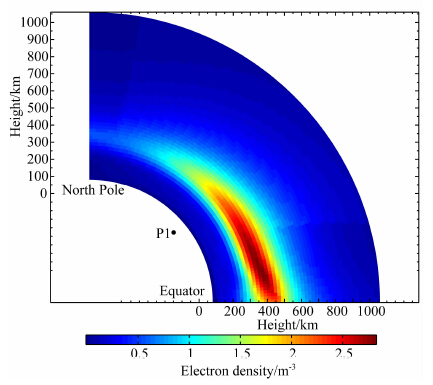 ![]() | 图 7 北半球150°W扇面的电子密度剖面.时间为2002年春分日00 ∶ 00 UT (14 ∶ 00 LT) Fig. 7 Electron density profile in the plane of the meridian 150°W,north hemisphere. The time is 00 ∶ 00 UT(14 ∶ 00 LT),vernal equinox in 2002 |