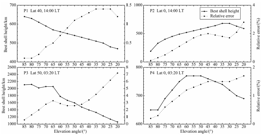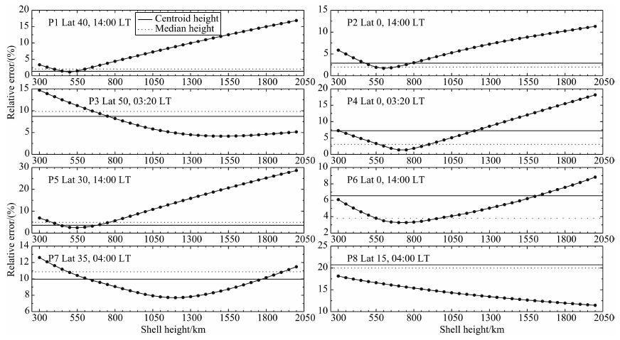 通过白天(P1和P2)与晚上(P3和P4)数据的对比,可以看到:在白天,薄壳高度较为稳定(一般为数百公里),转化带来的相对误差也比较小(不超过3%);但在夜晚,薄壳高度会呈现出较大的变化(最高可以超过2000 km),而且相对误差也会增大(最大超过7%).这一昼夜变化与图 3中的质心高度(及中值高度)的变化规律是相符合的.在白天,质心高度(及中值高度)较为稳定,相应的薄壳高度也变化不大;而在夜晚,质心高度(及中值高度)变化剧烈,最佳薄壳高度也呈现出同样的规律.