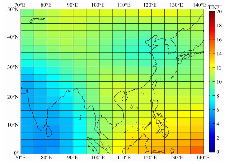 ![]() | 图 1 2008年1月1日00UT时刻研究区域内TEC空间分布 Fig. 1 TEC spatial distribution of the study area at 00UT on January 1,2008 |
