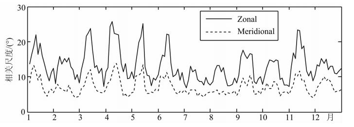 ![]() | 图 11 2008年中国区域内经向和纬向平均相关尺度随时间的变化 Fig. 11 Average correlation scales variations of 2008 in meridional and zonal with time in China |
