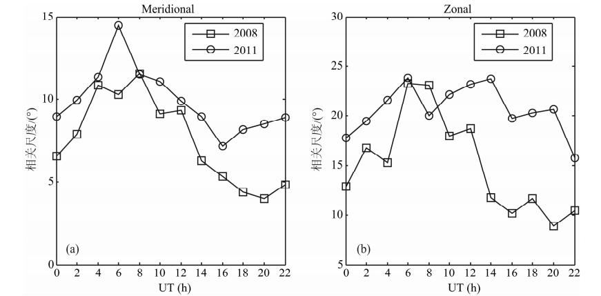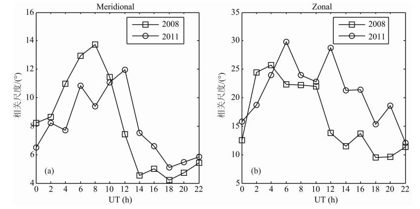 从图 11的分析中,我们发现太阳活动水平对相关尺度存在不可忽视的影响,因此,选取不同太阳活动水平条件下的2008年11月和2011年11月的数据进行比较分析.2008年为太阳活动低年且11月太阳活动水平低,而2011年为第24个太阳活动周的上升期且11月太阳活动水平较高,因此,忽视季节的影响,分别以这两个月为例,分析太阳活动水平对相关尺度的影响.图 12给出了不同太阳活动水平条件下中国区域内经向和纬向平均相关尺度随时间的变化情况.从图中可知,一般情况下,太阳活动水平越高,相关尺度越大,且纬向相关尺度对太阳活动水平变化的响应更剧烈.