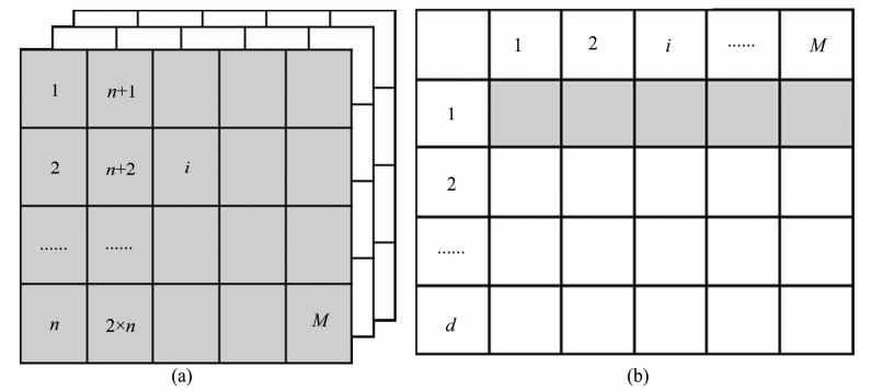 (2)针对月均值,每天都形成一个误差矩阵,为了进行协方差和相关系数的计算,需要将(1)中计算得到的各天的误差矩阵(图 2a)进行合并整理,得到一个完整的月误差矩阵(图 2b);图 2a中灰色表格代表一天的误差扰动,其空间分布与图 1类似,将其整理到图 2b中为一行向量,其中M为格网点的总个数,d为每月的天数;