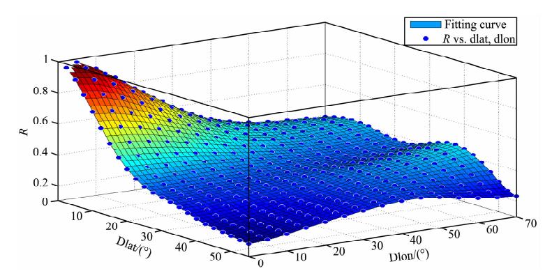 3 相关距离计算实例以中国区域2008年1月正午时刻为例,根据以上实施过程计算该条件下沿经度方向和纬度方向的相关距离.图 3给出了此时刻中国区域各站点平均相关系数与经纬度差的线性拟合曲面,由图中可以看出,在一定范围内,经纬度差越小,相关系数越大,当超过这个范围后,相关系数与经纬度差的关系则不再具有规律性变化.