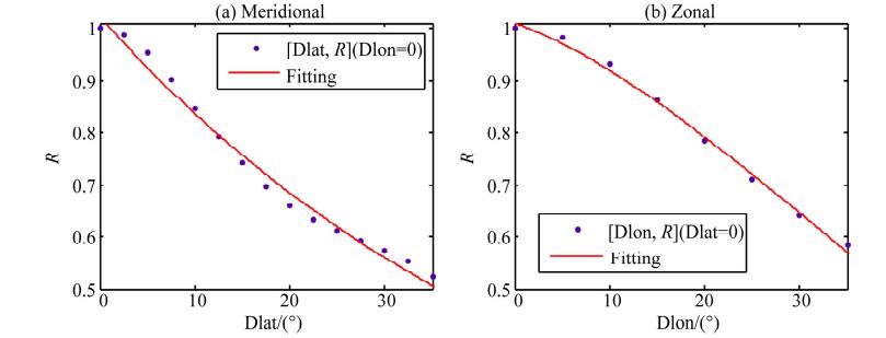 根据图 3示意,当dlon和dlat超过35°时,相关系数随dlon和dlat的增大出现异常增加的情况,这种现象在地理学上称为截断,并认为在截断距离外的空间变量的相关性可不予考虑,因此设置截断距离为35°,分别从经度方向和纬度方向对公式(1)进行拟合.单方向拟合时,公式(1)可理解为两个方向上相关系数的乘积,因此针对单方向拟合可采用