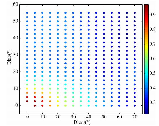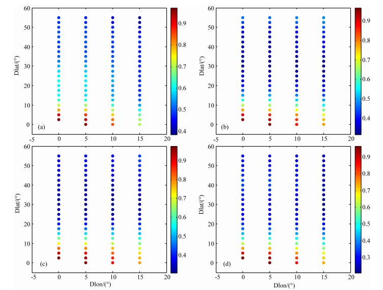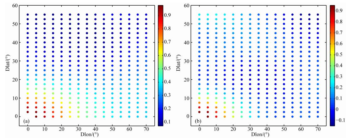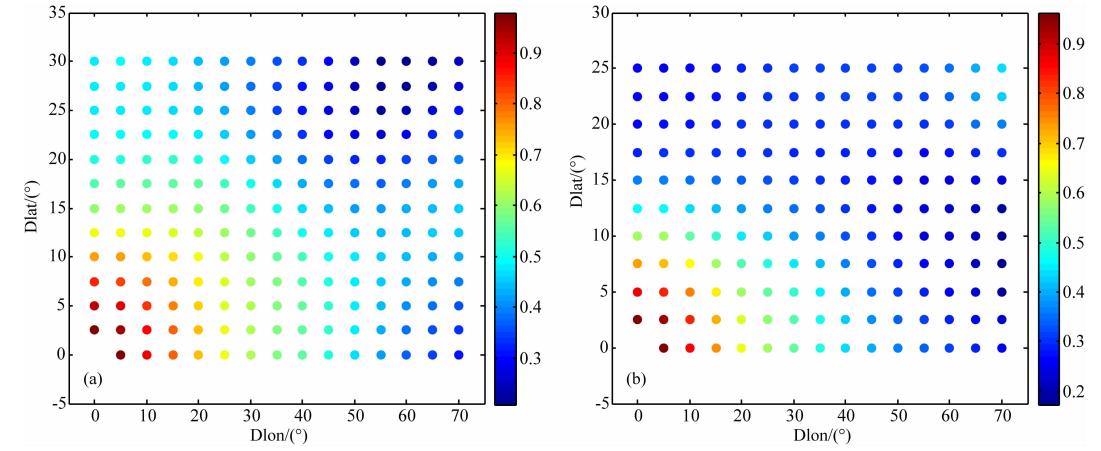 ![]() | 图 6 不同纬度范围内各格网点间平均相关系数随经纬度差异的空间分布((a)低纬地区;(b)中纬地区) Fig. 6 Spatial distribution of average correlation coefficient with latitude and longitude of different latitudes(a)Low latitudes;(b)Middle latitudes. |