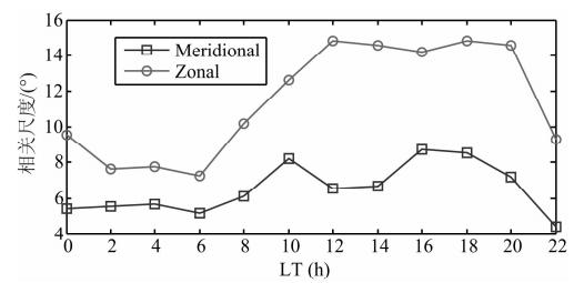 ![]() | 图 9 中国区域内经向和纬向平均相关尺度随当地时的变化 Fig. 9 Average correlation variations in meridional and zonal with local time in China |