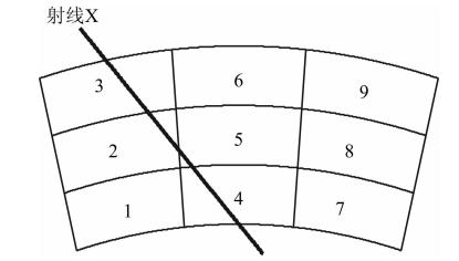 由图 2可知,射线X只穿过网格2、3、4、5网格,假设射线在这4个网格中的长度分别是a1、 a2、a3、a4,则射线X所确定的 A 矩阵为[0,a1,a2,a3,a4,0,0,0,0].