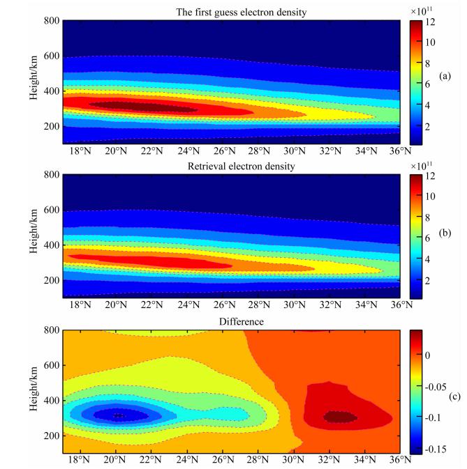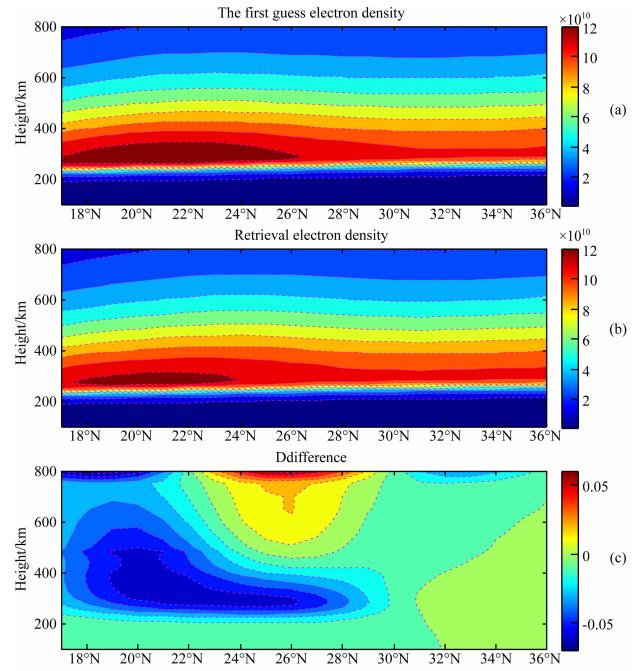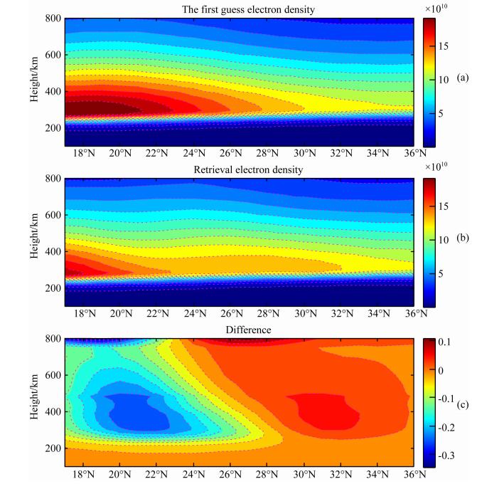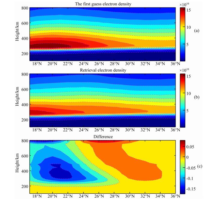 实验选取反演区的纬度范围为17°~36°,纬度间隔为1°;高度范围为100~800 km,网格高度划分为:100~200 km以及400~500 km间隔为20 km,200~400 km间隔为10 km,500~800 km间隔为50 km.
