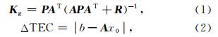 ,kα是一个调整因子,它是个常数,r表示误差域,aNe(k)表示估测电子密度的第k个分量.本实验中我们取r=0.2,Lz=30 km,L(α)=4°.R 矩阵通过经验给出,本实验取 R = k E,其中,E 表示单位阵,其维数为所有卫星信号射线数量之和,k =0.1×dim(E).