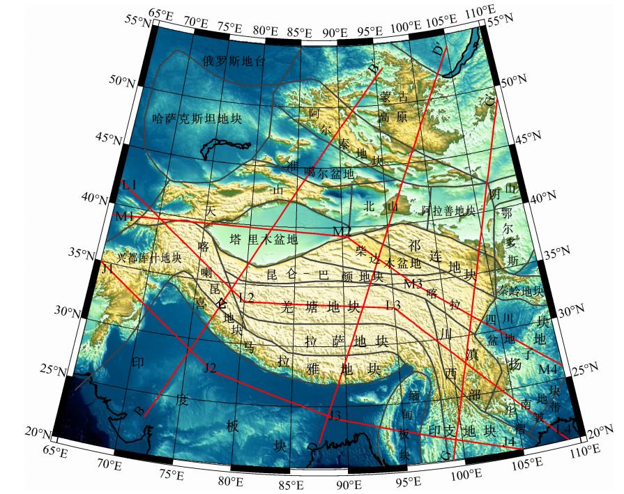 ![]() | 图 1 研究区域及主要构造单元(红线指示图 6中速度剖面的位置) Fig. 1 Study region and major tectonic units(Red lines indicate locations of velocity profiles in Fig. 6) |