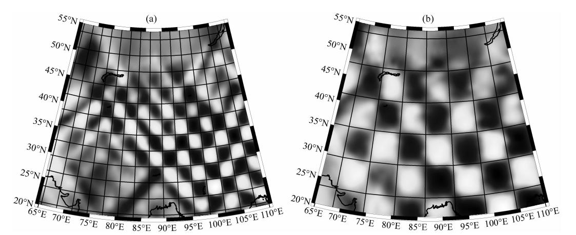 穿过本文研究区域的面波路径数在周期39.8 s时最多,达8525条.周期减小或增大时路径数都减少,10 s周期路径数为7235,184.7 s周期的路径数为3463条.利用棋盘模型对反演的分辨能力作了试验.理论模型为速度高低相间的棋盘状速度模型,通过正演计算得到每条路径的理论走时,然后随机叠加一个介于正负0.04 km·s-1的速度误差.利用与实际资料相同的路径和反演参数进行反演,考察输出结果与理论模型的符合程度.图 2a显示周期39.8 s,3°×3°棋盘模型的反演结果.可以看出除了研究区域的北、西边缘部分外,原始速度模型得到了较好恢复.图 2b显示周期184.7 s,6°×6°棋盘模型的反演结果,可见在深部路径覆盖最差的情况下,研究区内仍有不差于6°的分辨能力.综合实际资料的反演结果来判断,我们估计在地壳和岩石圈地幔深度的反演分辨率大约分别是3°和4°.