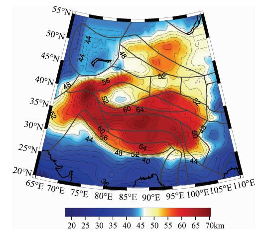 图 3给出由面波反演得到的研究区内莫霍面深 度分布,等值线间隔为2 km.面波给出的是忽略小尺度横向变化后的平均结果,在通常情况下由于层厚/速度折衷引起的不确定性估计为±1~2 km,但是在构造活动强烈的地区如青藏高原,我们对于下地壳和地幔顶部的真实速度没有确切的认识,因此地壳厚度的确定会有较大的误差.由图 3可见青藏高原及兴都库什—帕米尔—天山是地壳显著增厚的地区,地壳厚度在帕米尔达到70 km,青藏高原内部达68 km,在高原的边缘具有很大的水平梯度.西蒙古高原和阿尔泰山脉也是一个地壳增厚区,地壳厚度一般在52 km以上.而在构造作用以拉伸为主的地区,如中国大陆东部及边缘海,地壳减薄往往是构造活动强烈的标志.